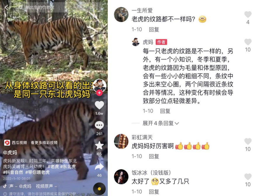 这些来自粉丝的互动,一定程度上也鼓励着黄宝莹继续从事东北虎相关工作。让她印象颇深的一位家长的留言,说是自家女儿很喜欢“虎妈”,每天写完作业就会来看看老虎们的日常,对小动物们也更有爱心了。“那个妈妈挺高兴的,我也很高兴,说明我的内容确实有让大家更喜欢东北虎”,黄宝莹说。