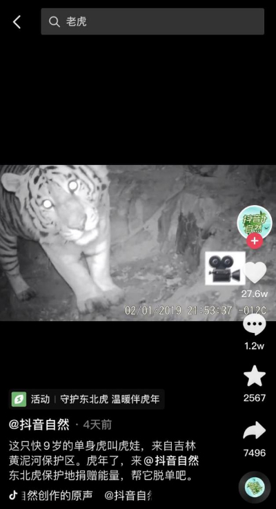 某种程度上来说,这个愿望正在实现。1月中旬,抖音上线了东北虎保护地。用户观看或拍摄动植物视频,就能为生活在吉林黄泥河、黑龙江大佳河等保护区的野生东北虎,争取改善栖息地植被、建设生态廊道的机会。利用这些生态廊道,原本被道路、村庄分隔开的栖息地得以连接起来,“虎娃”就能去其他领地认识心仪的母虎。截至1月26日,活动上线仅10天,就吸引了1900万名网友参与。