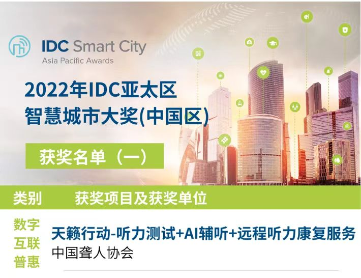 1月26日,评选历时近三个月的2022年IDC亚太区智慧城市大奖(中国区)获奖名单正式公布。其中,由中国聋人协会申报的“天籁行动-听力测试+AI辅听+远程听力康复服务”项目获得了“数字互联普惠”奖项。