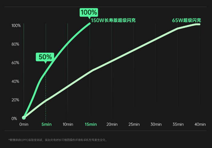 此外,OPPO还同时发布了长寿版150W超级闪充,沿用OPPO电荷泵直充技术,5分钟即可将等效 4500mAh电池容量的手机从1% 最高充至50%,最快15分钟充至100%。