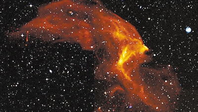 宇宙冲击波是星系团碰撞时产生的。这张照片显示了在Abell 3667星系团中观测到的两种冲击波中的一种,大约是银河系的60倍大。图片来源:物理学家组织网