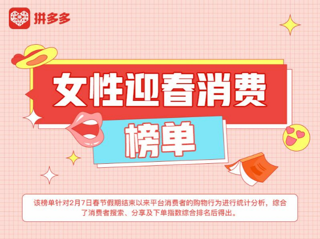 3月8日,新电商平台拼多多发布《女性迎春消费榜单》。该榜单针对2月7日春节假期结束以来至三八妇女节期间平台消费者的购物行为进行统计分析,综合了消费者搜索、分享及下单指数综合排名后得出。