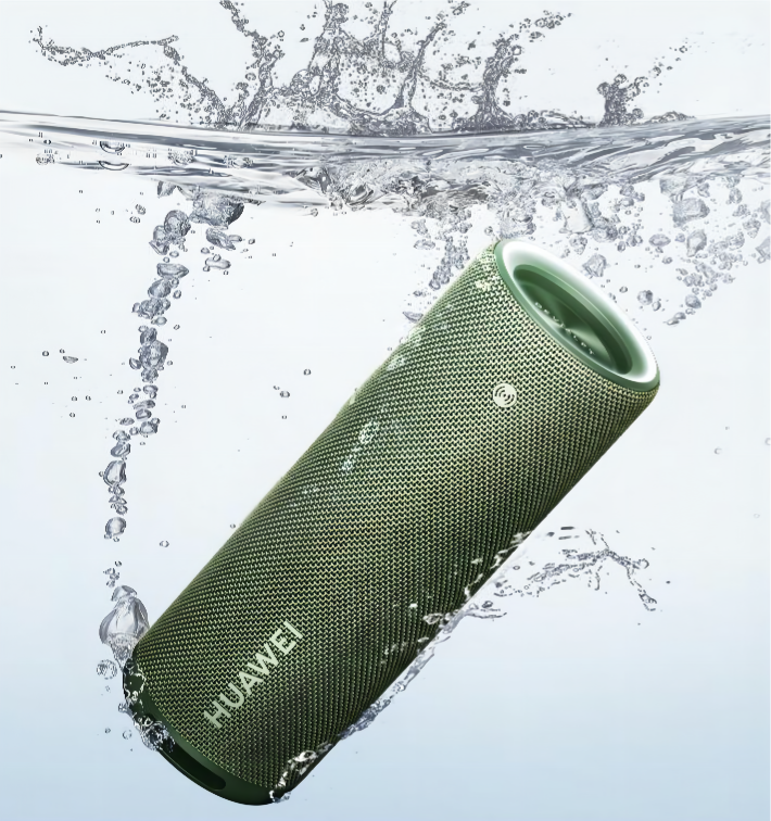 华为Sound Joy采用圆柱状机身设计,重量仅680g,可以被单手轻松握持,附带的挂绳也可以自由手拎或者挂起;0.8mm的超立体感包布材质由涤纶和棉纶两种材料横竖梭织而成,采用了双色双染工艺,两种颜色两种光泽相辅相成,呈现了丰富的层次和细腻的手感,并具有具有IP67 级防尘抗水,在雨天、泳池、浴室都可以自如使用。