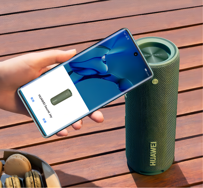 智能方面,华为Sound Joy搭载了HarmonyOS,为其传递了更多可能性。两台Sound Joy可以通过摇一摇的方式组合成立体声播放,当3台及以上Sound Joy同时摇动或长按模式切换键可以进入超级串联模式,让多台音箱同步播放。在户外使用Sound Joy时,可以用已经和音箱配网的手机一碰弹出卡片,分享手机热点,进而使用AI功能和在线音频。同时,它还支持HarmonyOS一碰传音,可以用手机一碰音箱,通过NFC就能建立连接并投音。