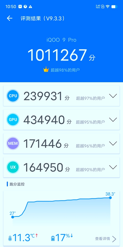 作为衡量手机性能高低的重要标准,iQOO 9 Pro安兔兔跑分超过101万,在全新旗舰手机中名列前茅。