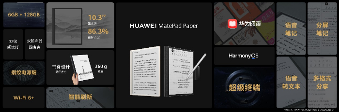 在MWC 2022上,华为发布了旗下首款墨水平板MatePad Paper,随后,3月16日,其在国内正式发布。华为墨水平板拥有10.3英寸护眼墨水屏,搭载HarmonyOS 2,标配第二代M-Pencil手写笔,带来丰富、便捷的笔记功能,同时拥有非常丰富的阅读资源及出色的硬件性能。在鸿蒙全场景交互的赋能下,支持跨设备流转、万能卡片桌面直达等,将为消费者带来更智慧的办公体验。