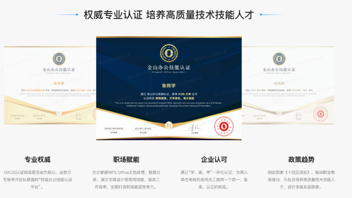 近日,金山办公WPS在国内上线集“学、练、考、评”一体化的办公技能认证平台——金山办公技能认证(Kingsoft Office Specialist,简称:KOS)。