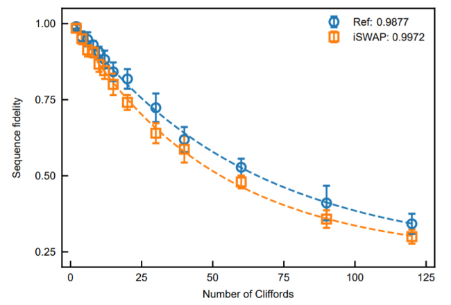 达摩院量子实验室还在fluxonium上验证了自研的超导量子芯片整体计算性能的优化方案,包括针对超导架构的单比特门通用优化编译方案,针对超导芯片上的另一种原生操控SQiSW门的即时最优编译方案等。该优化方案可以大幅提升量子芯片的整体性能指标。