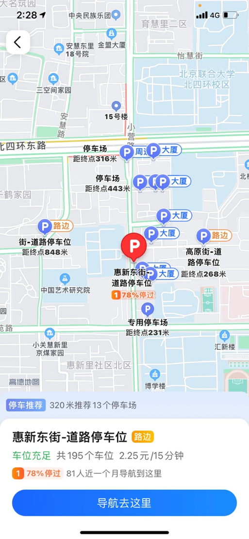 例如在行前,许多用户习惯事先查找目的地附近的停车相关信息,高德的“停车雷达”即能解决这类需求:在高德地图“驾车”页面输入出行起点和终点后,上划点击工具栏中的“停车雷达”,即可查看终点附近有哪些停车场,以及它们的具体位置、距离终点多远、车位情况、停车费用、在路边或者地下、是否内部专用等丰富信息,用户可据此进一步提前做好停车规划。