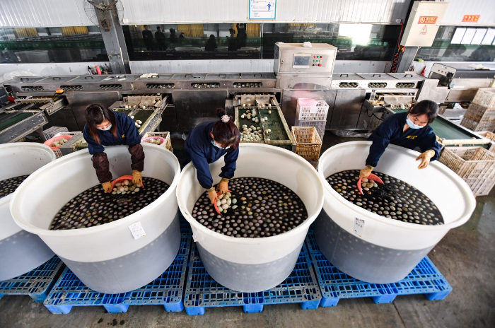 3月29日,在松淳蛋业的加工车间,工人们有条不紊地将鸭蛋码入全自动裂纹检测机和鸭蛋检测清洗机内,经过光选分级、裂纹检测、下缸浸泡、清洗风干等一系列步骤后,生产好的一枚枚皮蛋喷码出厂,被装进快递盒,经快递发往全国。