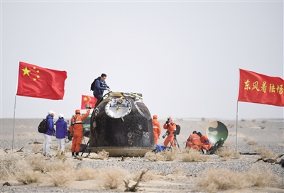 4月16日上午,一朵“红白伞花”缓缓降落在内蒙古的东风着陆场,神舟十三号载人飞船成功着陆,3名航天员安全回家。医监医保人员对航天员进行状态检查后,3名航天员表示:“感觉良好。”