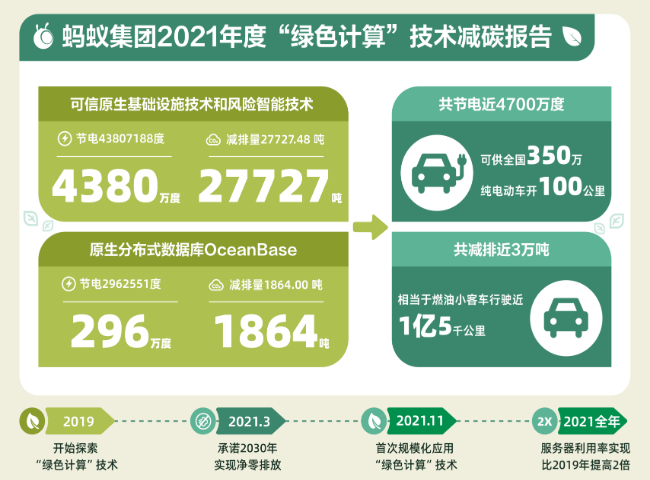 蚂蚁集团从2019年开始研发“绿色计算”技术,并于去年“双11”期间首次规模化应用,2021年蚂蚁集团的资源利用率已达到2019年的两倍。