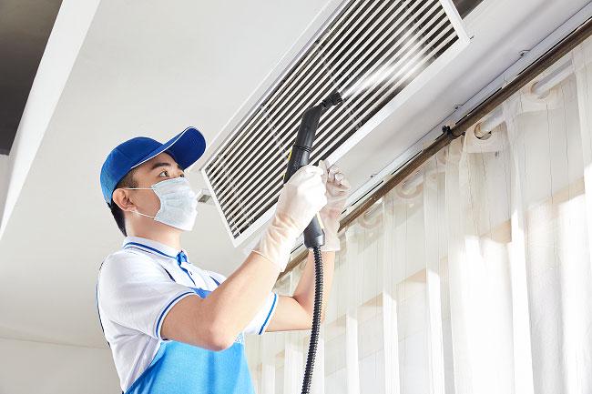 图为轻喜到家家居工程师进行空调高温蒸汽洗服务