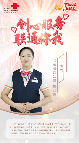 像这样的例子还有很多,在工作岗位上,陈辰坚持用自己的实际行动践行着“客户为本,员工为根,服务为上,创新为魂,奋斗为荣”的核心价值观,以热情、耐心、细致、周到的服务打动了一批又一批客户朋友,连续三个月客户端到端评价满分,连续四周收到用户表扬信,是营业厅专业线当之无愧的“服务之星”。