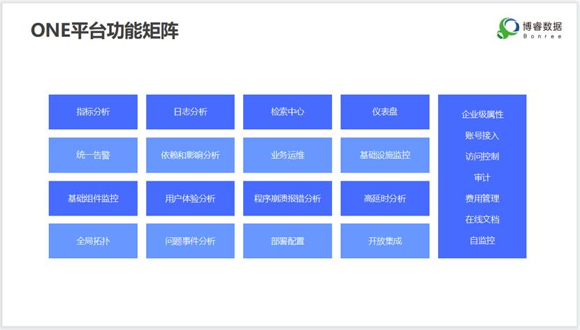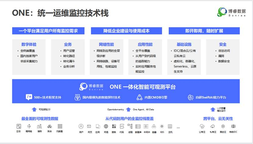 5月20 日,博睿数据正式推出了一体化智能可观测平台ONE,该平台旨在建立一体化、智能化、面向业务与用户体验的统一运维平台,助力企业提高数字化体验,降低运维成本,提升工作效率,为数字化转型赋能升级。同时,这也是业界第一个将所有运维监控需求“All in ONE”的统一平台。