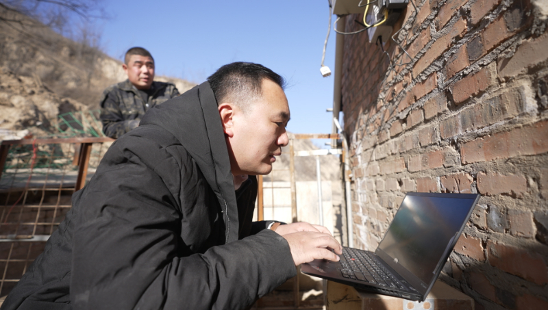 阿里巴巴员工在陕西清涧县教农民用物联网技术辅助土猪养殖。
