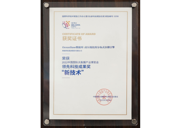2022数博会领先科技成果奖“新技术”OceanBase获奖证书