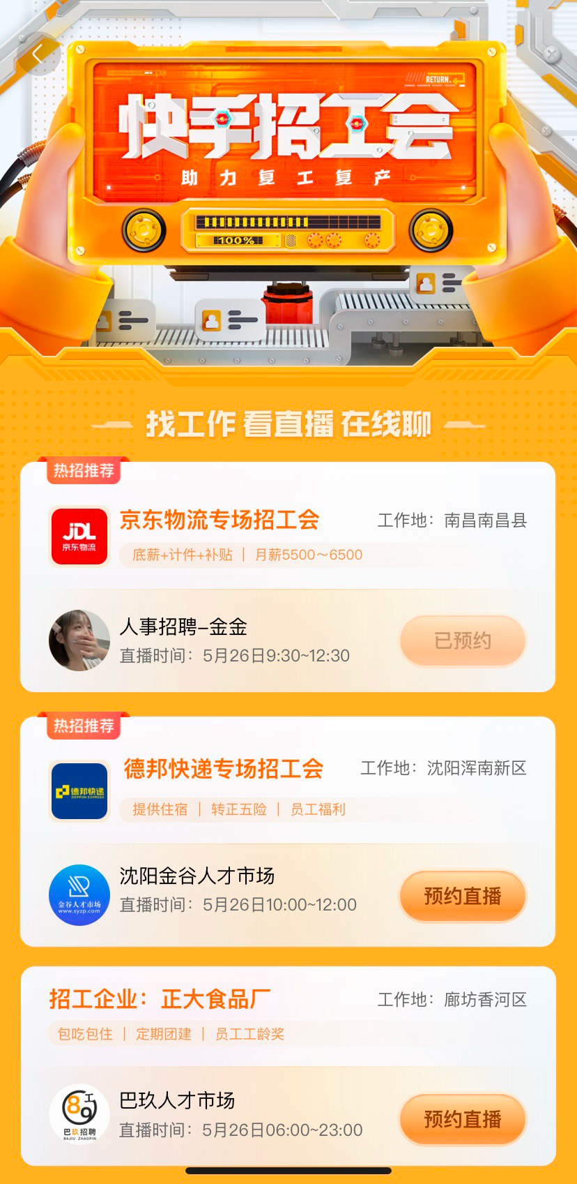日前,快手正式推出“快手招工会”。5月24日至6月15日,快手平台补贴10亿流量,推出600余场直播招聘专场,100多家优质用工企业,提供近20万个岗位。