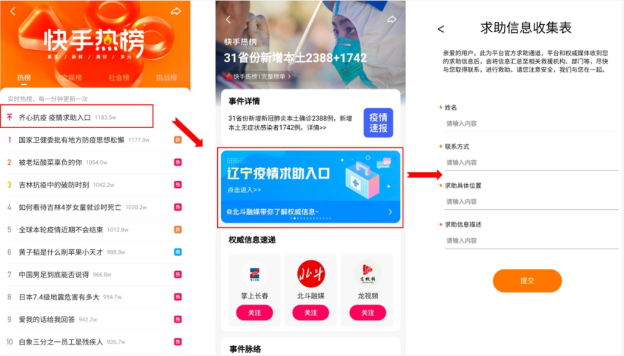此外,快手坚持以“短视频+直播”创新疫情防控宣传,向数亿用户及时传递疫情的准确信息,尽最大力度普及防治知识。在疫情反弹之际,快手开通了疫情求助入口,利用自身的资源高效传递信息,为有诉求的人们打开一扇求助之门,致力于帮助保障用户正常生活。截至2022年4月8日,快手共上线了14个省级求助入口和1个市级求助入口,本地push、热榜、短视频话题、搜索等多个板块也均有求助入口。