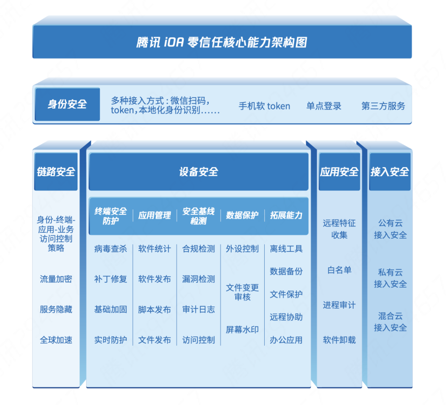 作为国内最早布局零信任的大型厂商之一,腾讯从2015年就开始自主设计、研发零信任架构,基于身份可信、应用可信、设备可信、链路可信的4T原则,打造出零信任安全管理系统——腾讯iOA。让员工实现无论位于何处(Anywhere)、何时(Anytime)使用何设备(Any device)都可安全稳定地访问授权资源以处理任何业务(Any work)的新型“4A办公”方式。