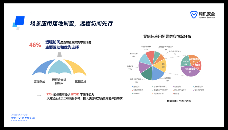 论坛上,中国信通院云计算与大数据研究所所长何宝宏公布的信通院调查数据显示,当前有46%的企业选择零信任是源于“远程访问”的需求,“远程访问”是当前企业实施零信任的主要驱动和优先选择。与此同时,有77%的供应商提供BYOD (自带设备)零信任能力,以满足企业员工在设备多样、接入便捷等方面更高的体验需求。