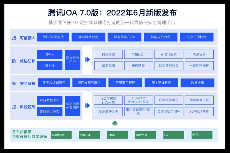 在此背景下,腾讯安全重磅发布了全新升级的零信任安全管理系统——腾讯零信任iOA7.0版本。据了解,腾讯零信任iOA7.0在可信接入、威胁防护、安全管理、风险控制及全平台覆盖等维度上实现了焕新升级,提升了接入安全性和效率,打造了立体防御体系,实现多平台终端全管控和XDR全程联动响应;此外在平台覆盖上也提升了产品自适配度,有效支持企业设备和自带设备。