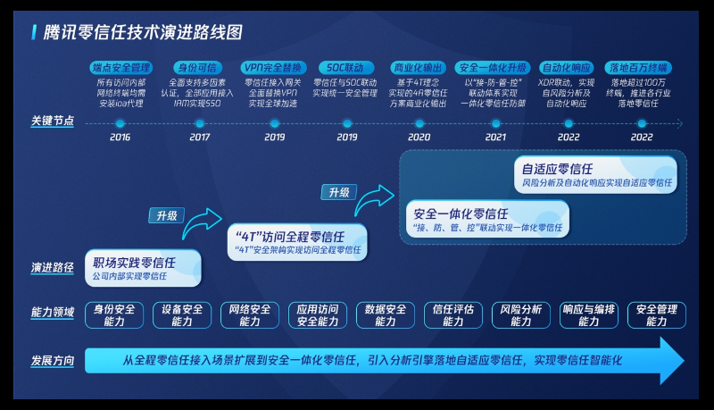 “零信任”理念自2010年提出以来,发展至今已有12年,作为国内最早实践零信任的企业之一,腾讯在论坛上首次对外披露了“零信任技术演进路线图”