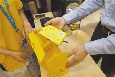 苏宁易购物流快递员正在使用其循环快递箱“漂流箱”开展收寄业务苏宁易购物流供图