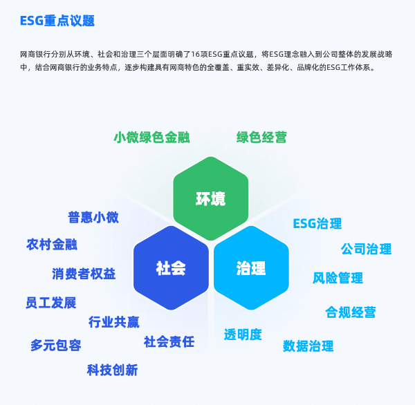 该报告聚焦对网商银行运营具备重要影响且各利益相关方普遍关注的议题,识别出16个实质性议题,进行重点披露和回应。同时,为保障ESG战略的施行,网商银行构建了相关组织保障,包括建设“决策层-管理层-执行层”的三层ESG管理架构,确保ESG工作的推进。
