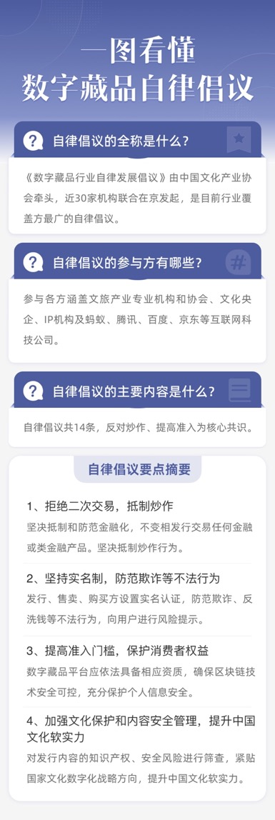 6月30日,在中国文化产业协会牵头下,近30家机构联合在京发起《数字藏品行业自律发展倡议》,反对二次交易和炒作、提高准入标准成行业高质量发展的核心共识。据悉,参与各方涵盖文旅产业专业机构和协会、文化央企、IP机构以及蚂蚁、腾讯、百度、京东等互联网科技公司。