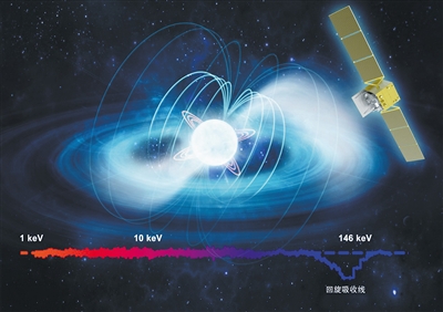 “回旋吸收线处的能量对应的磁场强度就是中子星表面的磁场强度,这是目前直接测量中子星表面磁场强度的唯一方法。”张双南说道。
