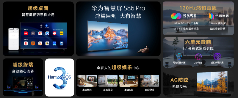 据介绍,华为智慧屏S86 Pro作为华为首款86吋智慧屏,是一款具备影院音画、且具备最新HarmonyOS 3特性的鸿蒙智慧屏。它延续金属拉丝边框的匠心工艺,深空灰的金属色泽更具高端质感,与万千家居风格优雅适配。