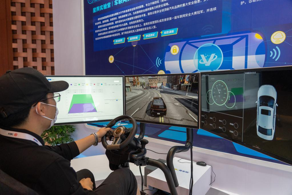 7月28日,在2022全球数字经济大会精品主题展上,一名工作人员进行汽车仿真平台漏洞攻防演示。
