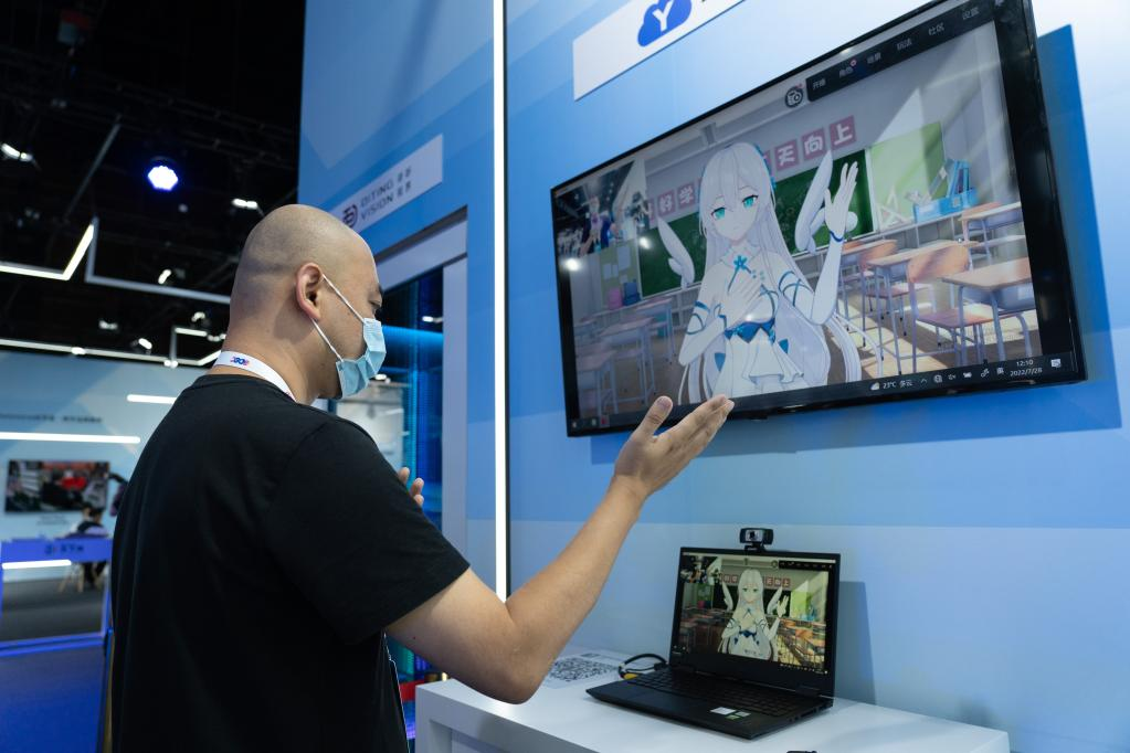 7月28日,在2022全球数字经济大会元宇宙体验馆,一名工作人员展示“云游长城”小程序。