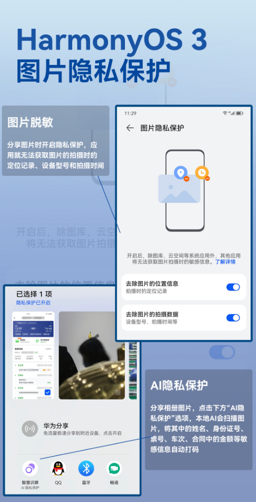 针对图片,鸿蒙3提供了图片隐私保护功能,一键擦除图片的敏感信息。同时针对社交分享,鸿蒙3新增了AI隐私保护功能。当用户分享图片时,可以选择AI隐私保护功能来隐藏个人信息,实现对图片中的姓名、连续4位以上的数字(如身份证号、票号、金额)等敏感信息一键涂鸦,其它信息也可手动打码。