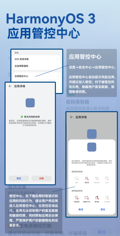 基于此,鸿蒙3进一步提升用户隐私安全保障,让应用权限访问、设备安全状态更加透明可控、用户数据保护更加简单安心。在延续鸿蒙2“确保正确的人,在正确的设备上,正确地使用数据”的基础上,让用户免侵扰、隐私无泄露、安全有保障,构建更加安全、纯净的鸿蒙世界。