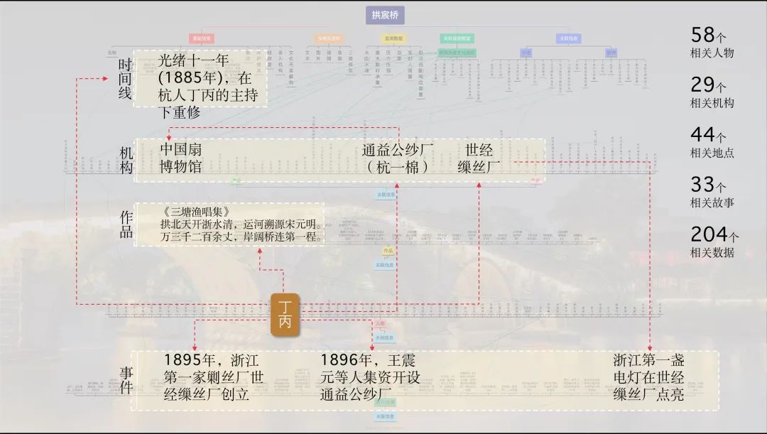 以杭州“拱宸桥”为例,通过文化大数据平台,可以得到与“拱宸桥”相关人物58个,相关机构29个,相关地点44个,相关故事33个,相关数据204个。其中,“丁丙”作为藏书家、企业家、慈善家,就有很多与拱宸桥、运河有关的故事。