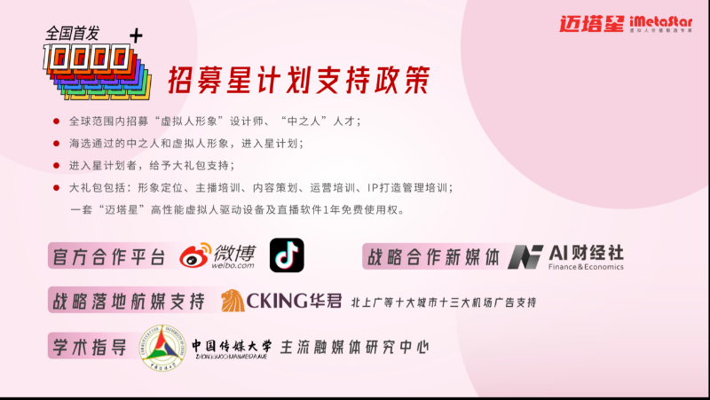 在该计划中,迈塔星将联合微博、抖音两大合作平台,在全球范围内招募“虚拟人形象”设计师、中之人、主播达人、MCN机构、品牌主,通过专家、导师组成的评审团海选的中之人、虚拟人形象,将直接进入星计划支持名单,官方将给予大礼包支持,该礼包包括形象定位、主播培训、内容策划、运营培训、IP打造等,以及四大赋能政策支持:免费提供迈塔星动捕设备及软件、运营培训、IP曝光和商业变现等四大维度的支持。