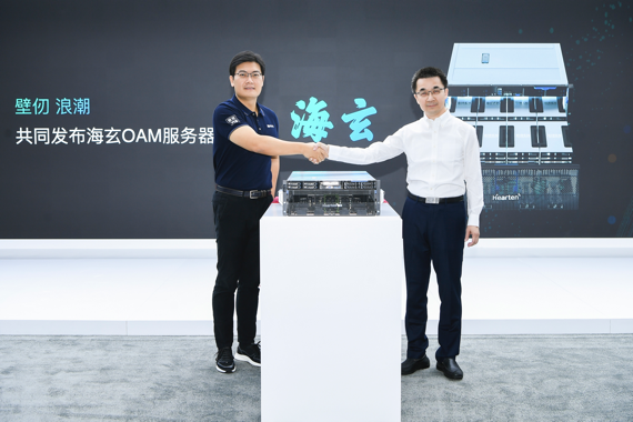 会上,壁仞科技联合创始人、总裁徐凌杰和浪潮信息副总裁、AI&HPC产品线总经理刘军,共同揭幕OAM服务器——海玄。