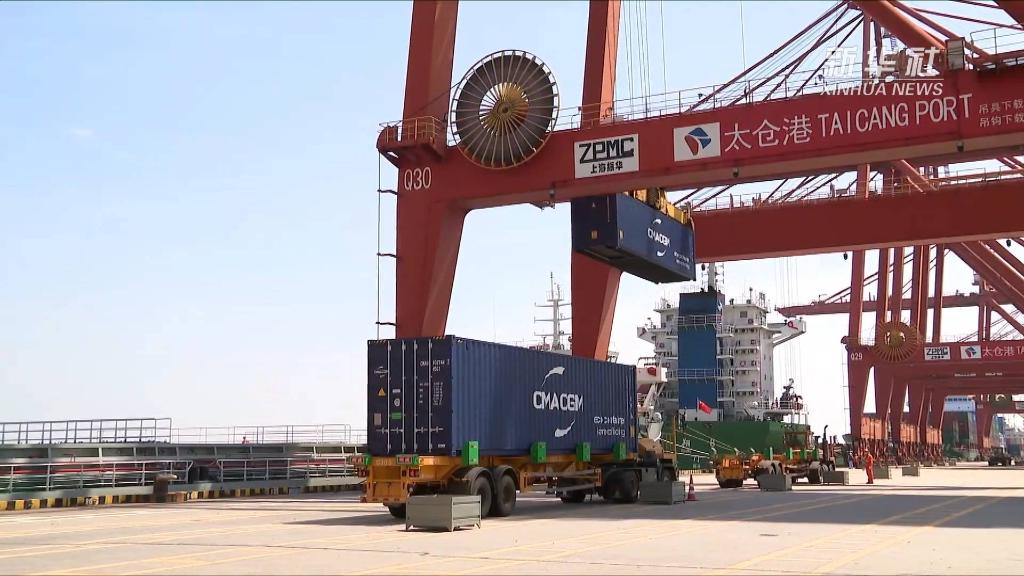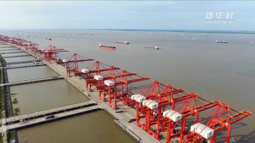 江苏苏州太仓港位于长江入海口南岸。太仓港四期码头岸边,巨型岸桥依次排开,为江上停靠的货运船只提供装卸服务。
