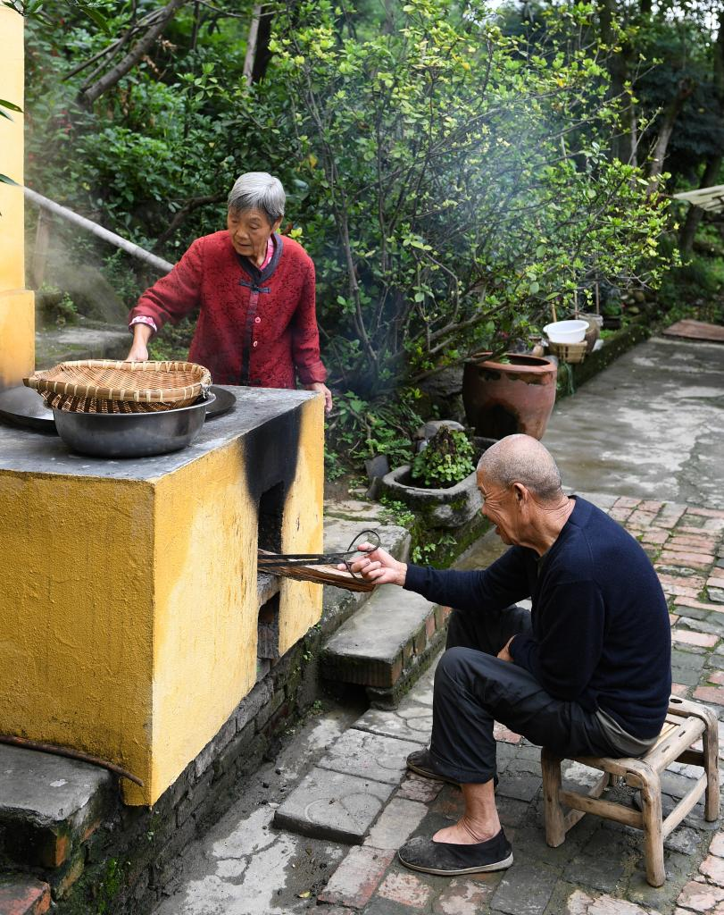陈桂刚(左)和老伴张祥芬正在烧火做饭。新华社记者 邹竞一 摄