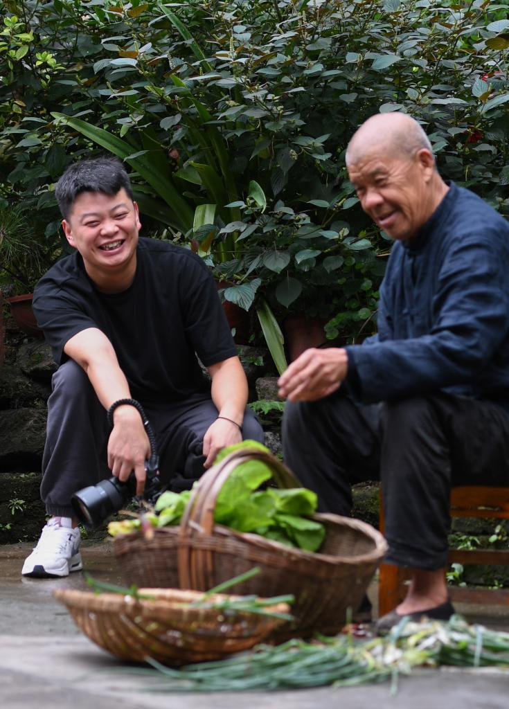 张万露(左)在拍摄间隙与爷爷聊天。新华社记者 邹竞一 摄