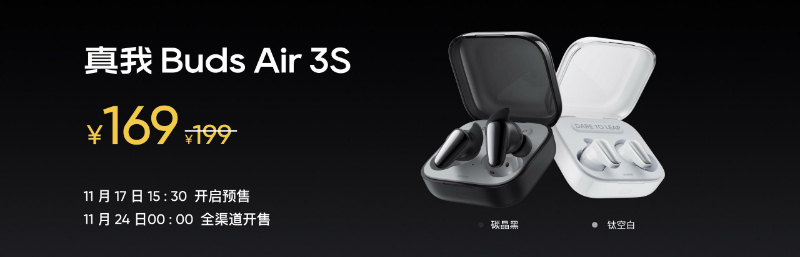 与真我10系列一同发布的,还有音质越级的TWS耳机产品真我Buds Air 3S。真我Buds Air 3S采用全新研发的蓝鲸振膜,11mm低音动圈,支持杜比全景声Dolby atmos,为用户带来震撼听感。耳机仓采用了新“乐”光宝盒设计, 30小时超长续航、自定义EQ调音、69ms游戏低延时等全方位的越级体验。真我Buds Air 3S的售价为199元,首销限时价169元。