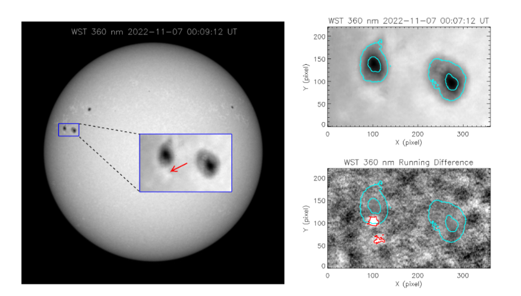 WST/LST在2022年11月7日观测到1个白光耀斑,右边红色等值线为连续谱增强位置相对黑子的位置。(中科院紫金山天文台供图)