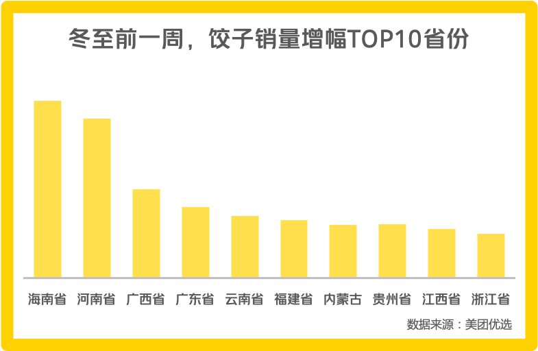 美团优选数据显示,12月15日至20日,平台上的汤圆销量同比上月增长了50%,饺子销量增长30%。其中,饺子销量增幅前10位的省份中仅有河南一个北方省份,海南、广西的销量增速甚至超过100%,达到近几个月的高峰。值得一提的是,河南、山东、陕西三省的汤圆销量均位列全国前10,成为既爱饺子也中意汤圆的“北方代表队”。