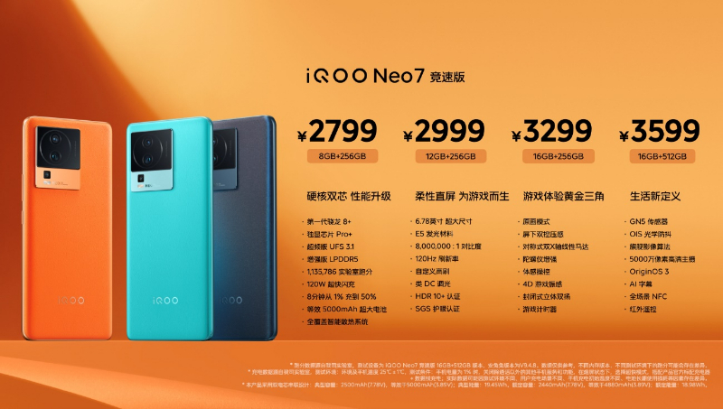 iQOO Neo7竞速版搭载第一代骁龙8+,主频最高可达3.2GHz,与为游戏而生的独立显示芯片 Pro+共组“硬核双芯”,更配有增强版LPDDR5和超频版UFS 3.1。Neo7 竞速版有最高16GB RAM+512GB ROM大运存大存储组合可选,满足用户对更强多任务和更多存储空间的需求。