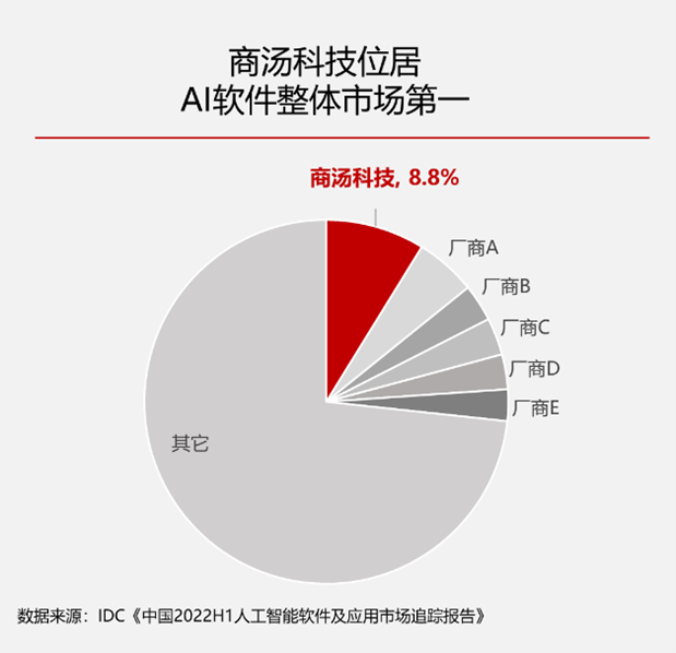近日,IDC发布《2022上半年人工智能及软件市场追踪报告》,报告显示,商汤科技位居中国AI软件市场第一,成为市场领导者。同时,在关键的计算机视觉子市场,商汤连续六年蝉联第一,整体市场份额占比达20.7%,超过第二名到第四名之和。不仅如此,商汤在2022年还获得了诸多第三方权威市场分析师机构相关报告的高度评价,在各类产品技术能力与市场份额评估中表现突出,彰显了强大的行业领导力和市场标杆作用。