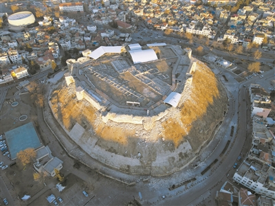 这是2月10日用无人机航拍的土耳其加济安泰普城堡。据当地媒体报道,该城堡在6日发生的地震中严重损毁。 新华社发(穆斯塔法·卡亚摄)