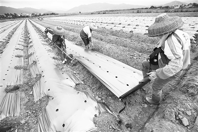 农民在海南三亚天涯区槟榔河片区田间铺上生物降解地膜。