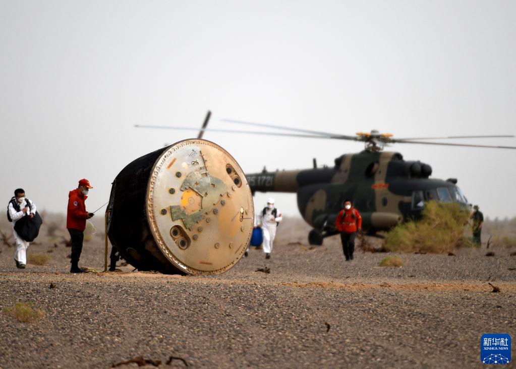 反推发动机成功点火后,返回舱在一望无际的戈壁上着陆。褐色的返回舱散发着淡淡的焦糊味,在周遭留下一圈圈浅浅的沙坑。